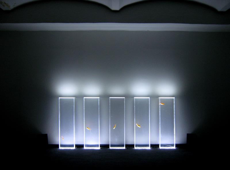 The vertical movements of the 5 shes in the aquarius is captured by a sensor that translates (through a computer software) their movements in digital sound signals.